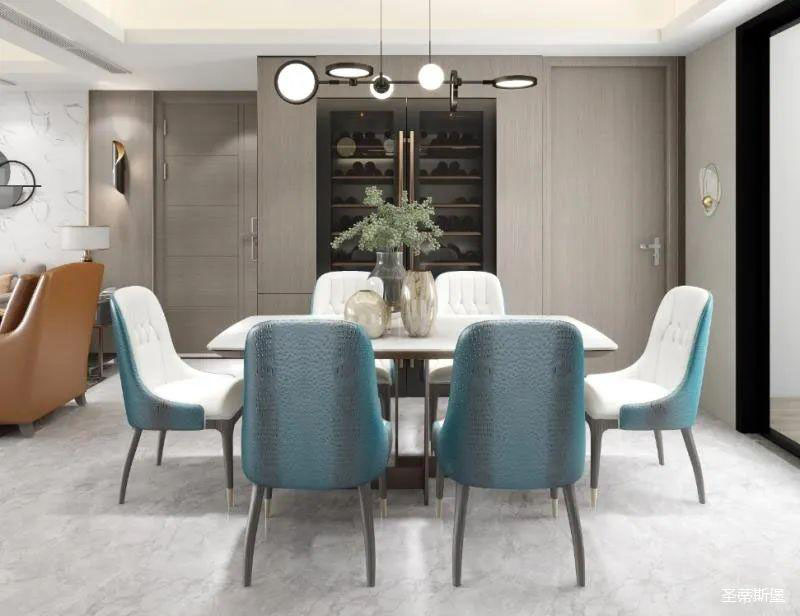 ▲澄亮湖藍的餐桌椅,一定是空間的點睛之處,溫柔跳脫的色彩,賦予了生活多姿多彩的體驗。經典黑的簡約燈飾,在不忘溫馨氛圍的同時,也引領著造型界的時尚潮流。