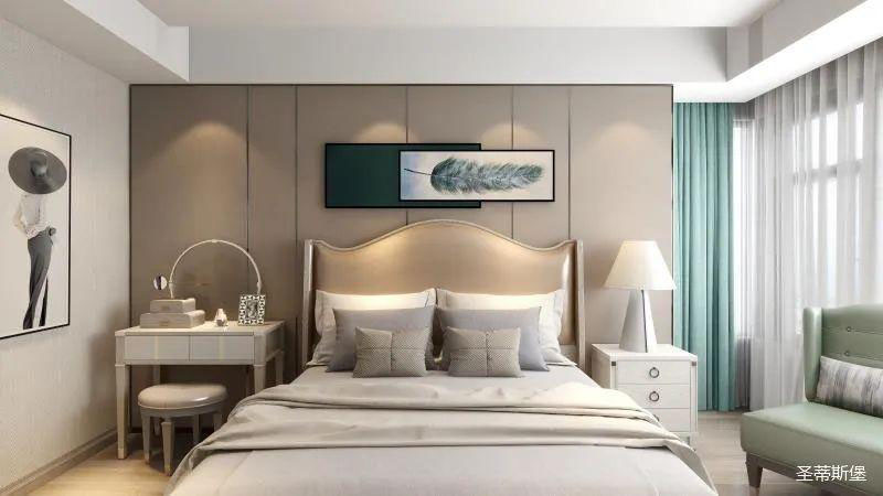 ▲次臥空間主要是以淺色為底調,大面積的莫蘭迪色與淺色相平衡。極強線性裝飾畫帶來的延伸感讓視覺煥然一新。少許的金屬元素攝入,瞬間提升了空間的精致度,將溫潤雅致與時尚輕奢糅合在同一空間里,每一處都洋溢著浪漫的氣息。