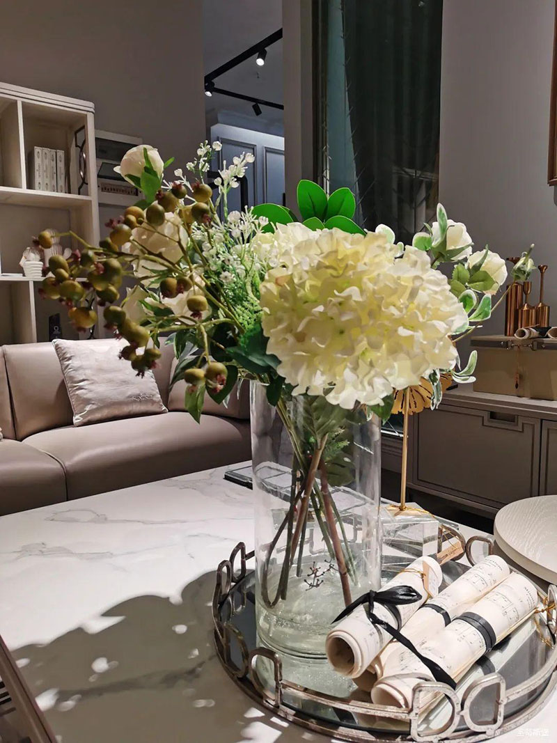 3.輕奢的配飾也需邀來似錦繁花相稱。色彩跳脫的植物更為亮眼,讓自然界的色彩與姿態應和空間之間的協調,傳遞空間與情感的共鳴。