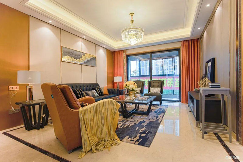 愛馬仕橙的休閑椅是空間的點睛之筆,相對于霸氣沉穩的墨綠雙人沙發,它更為時尚摩登,兩者合理搭配,賦予了空間陽剛與柔情并存的意境。