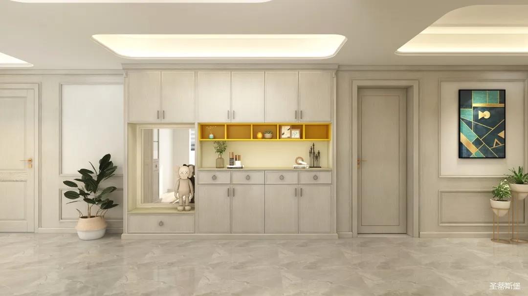 ▲臥室是居家的主要休息場所,在設計上需更注重舒適度。所以房間就以和諧淡雅的色彩為主,采用素雅柔和的線條布局,時尚輕奢的家具,使得空間更加的愜意和浪漫。床頭層林盡染裝飾畫,讓原本略偏美式淡雅的臥室在色彩上更添一筆。