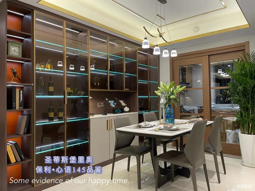 ▲餐廳一面及頂的透明柜體,以簡練的金屬線條分割出收納空間,讓立面視覺更顯精致干凈。餐邊柜設置了臺面、全玻璃展示區以及隱藏收納區,滿足了日常生活中多樣的收納需求。