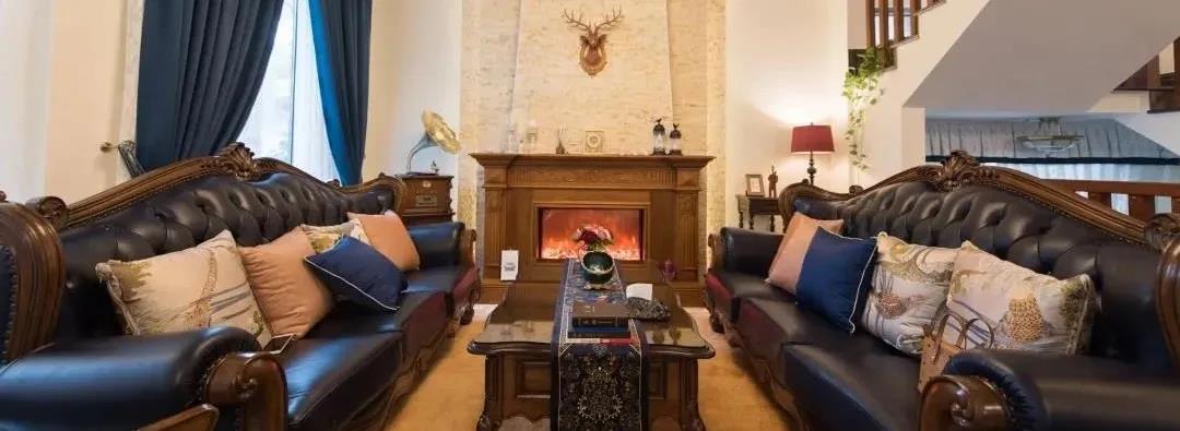 ▲客廳以灰色為主調,電視背景墻采用拼接大理石搭配實木闌珊,與對立墻面形成撞色處理,既可以加深空間層次感,也提升了空間明亮度。一字型真皮沙發與實木電視柜中和了大空間的空曠,打造出一個談心敘話的和諧空間。