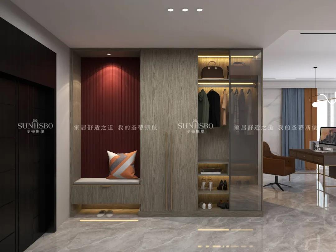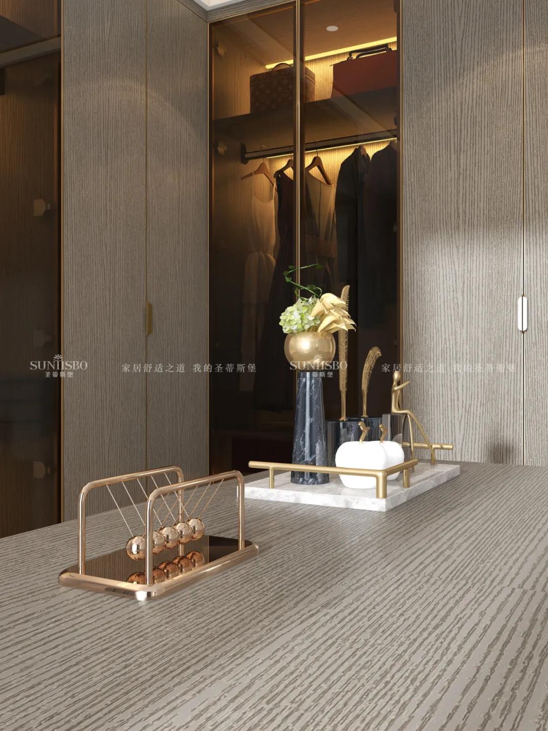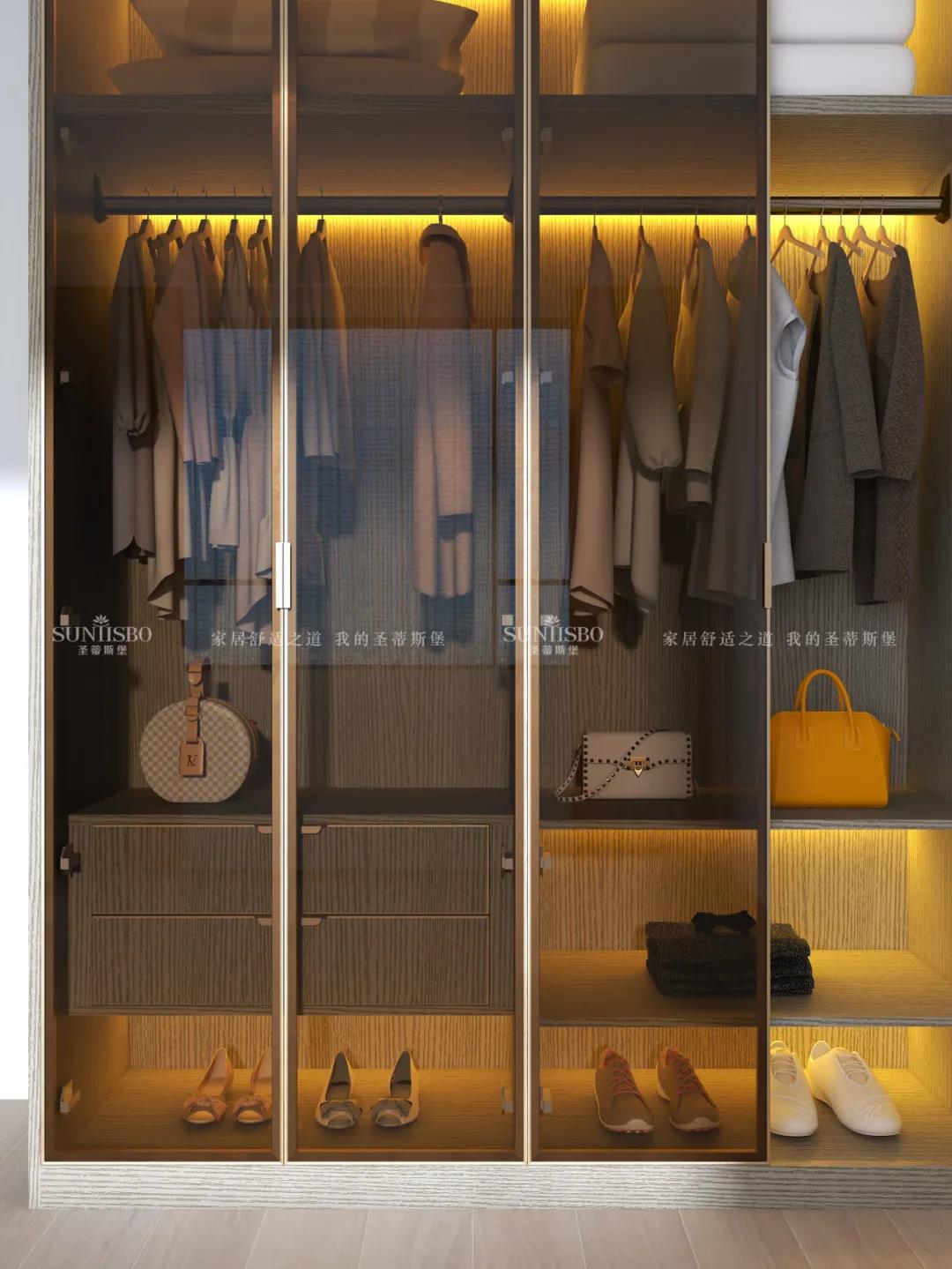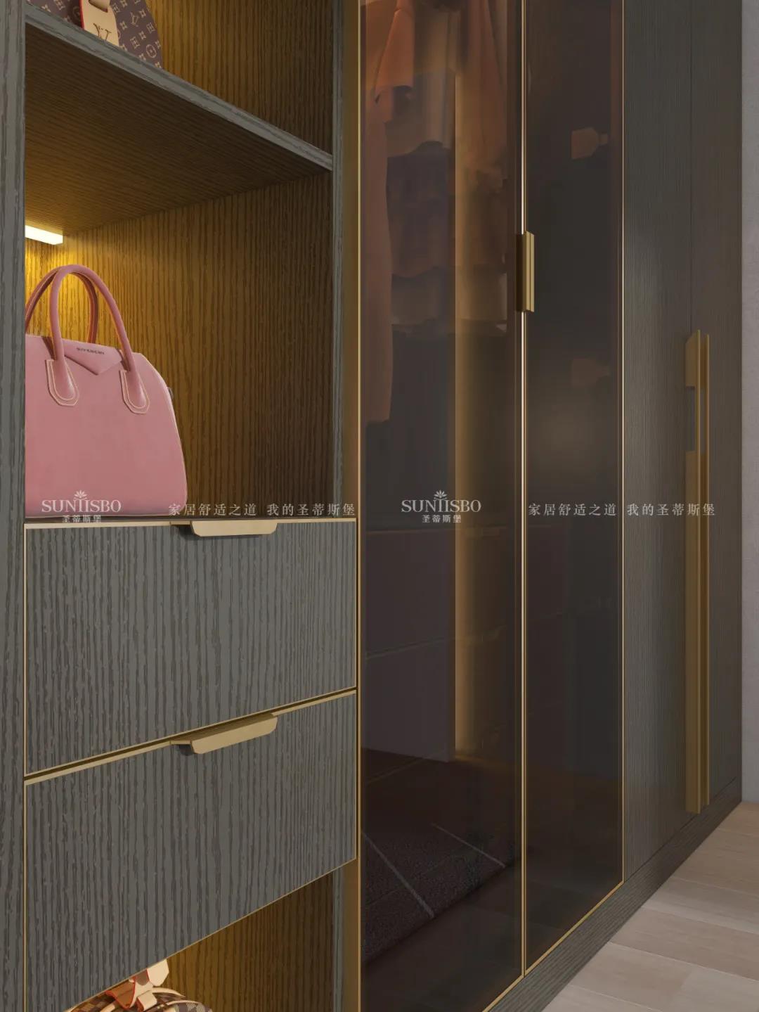 衣柜采用一體化的定制形式,木紋配合開放式玻璃柜門,從懸掛區收納、抽屜收納到鞋子收納等,均滿足超大收納系統,讓每一件衣物都有自己的歸宿,更為愛美的你量身打造可觀賞的儲物空間。