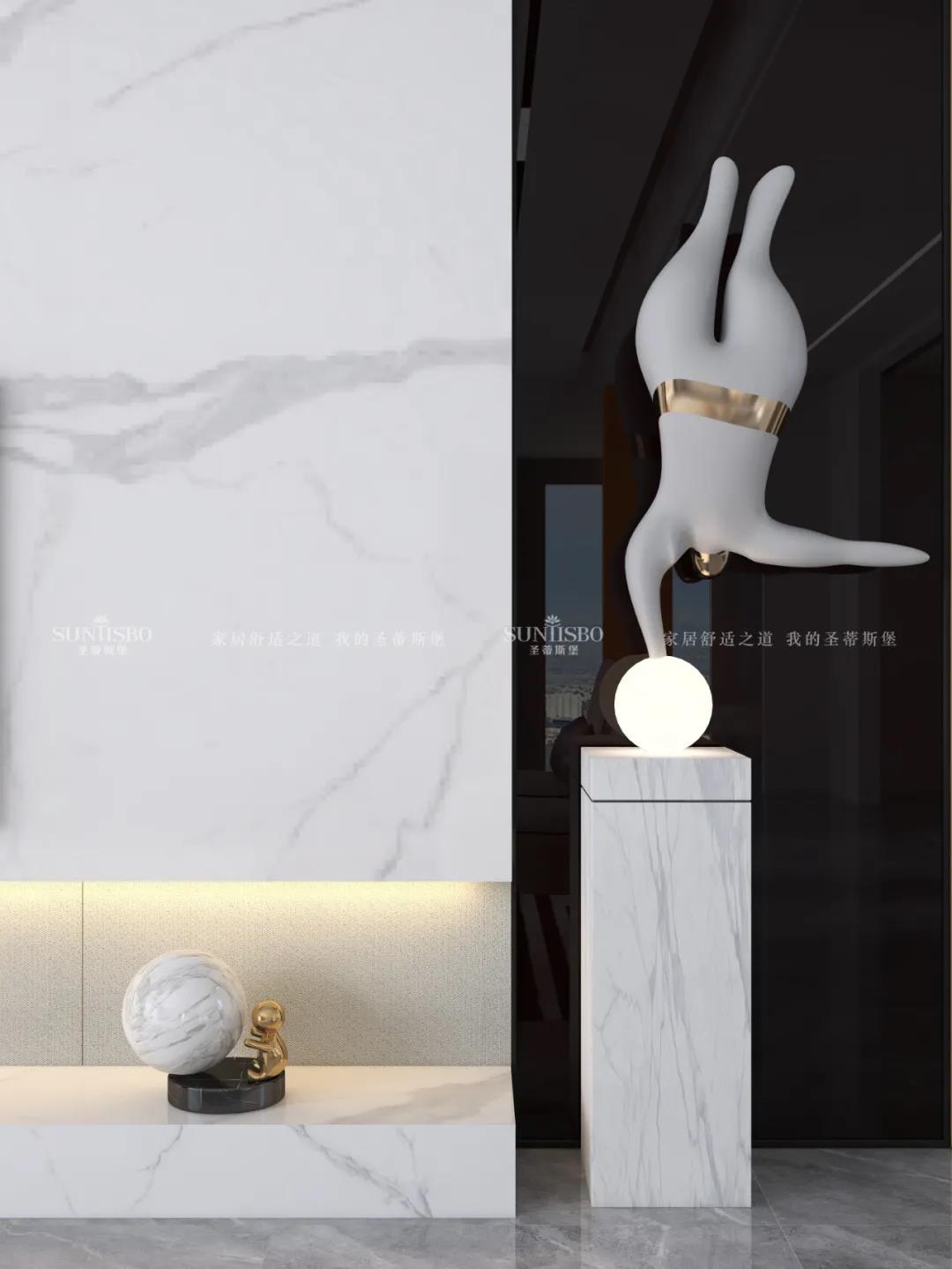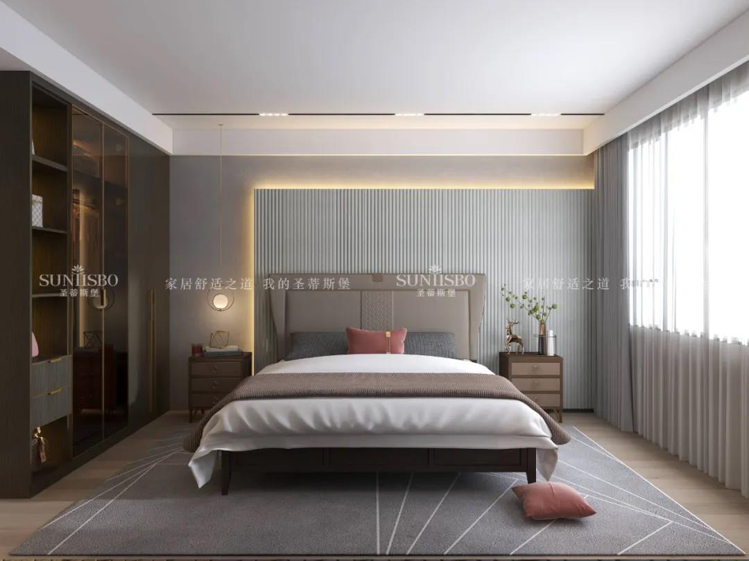 簡明而干凈的流線背景墻,猶如瀑布一瀉千里。床屏顏色的選擇以素雅的駝色和溫潤的木色呈現質感,精巧別致的燈具與背景墻光影,透視出空間動靜之間的歡快。每一縷陽光灑落,都緊緊包裹著未曾安放的靈魂。