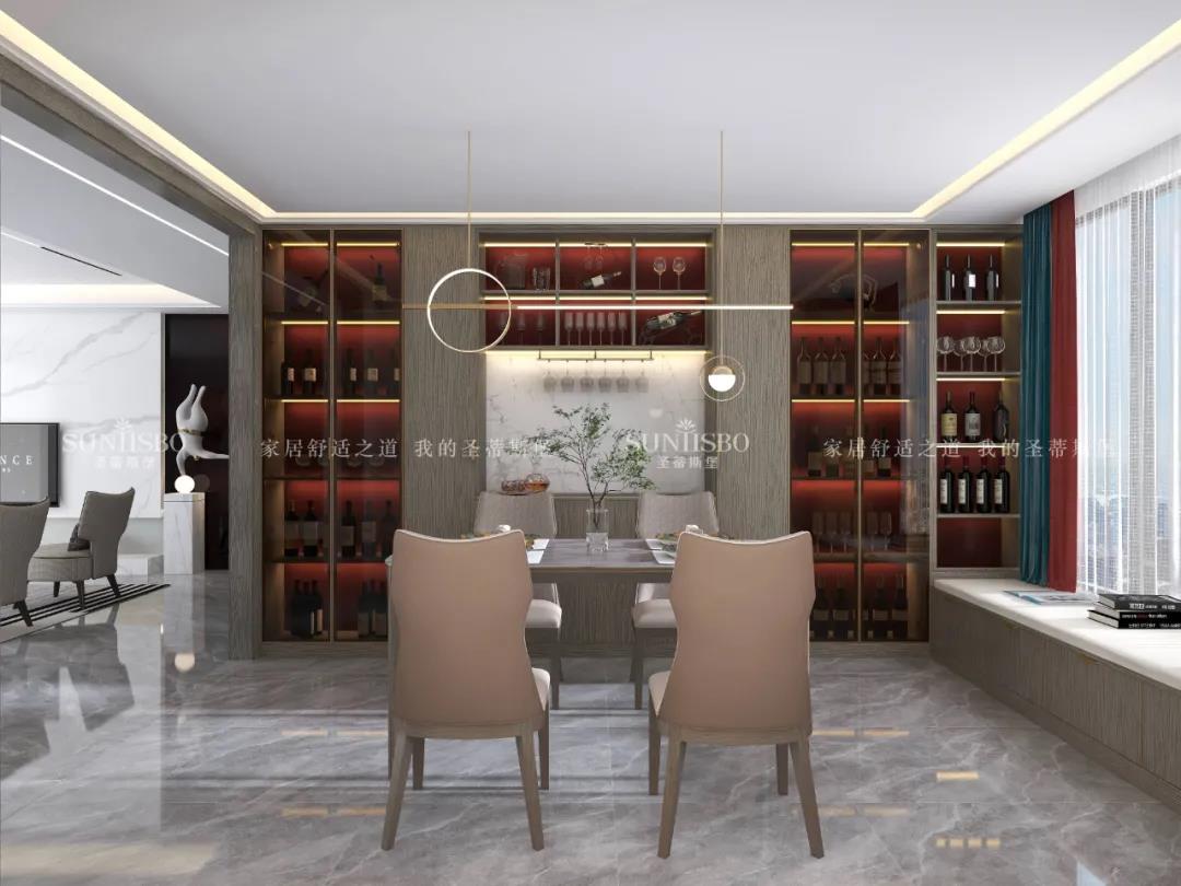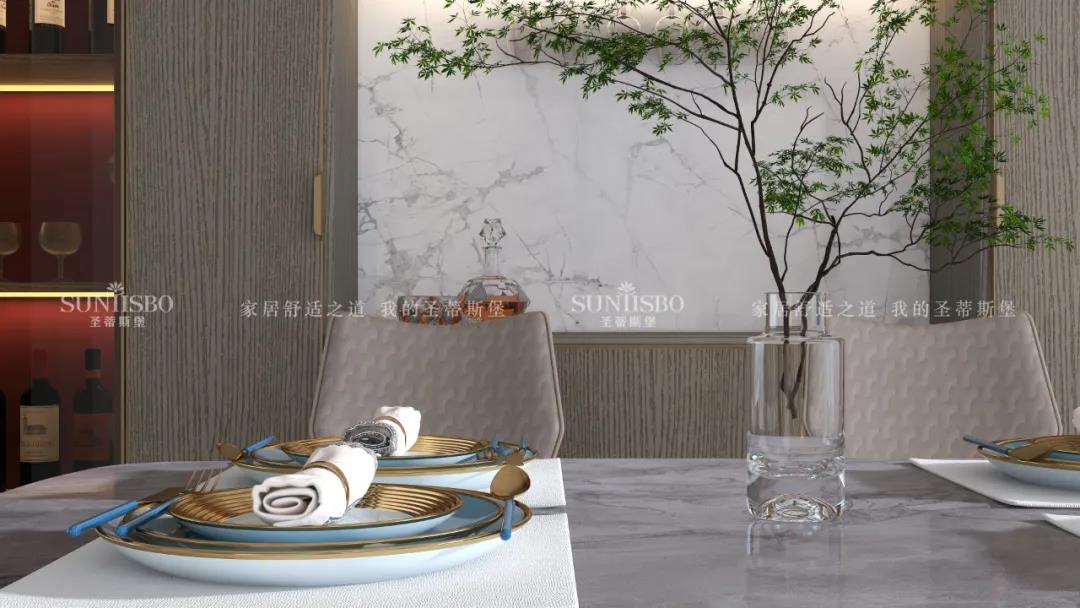 簡奢餐桌與玻璃大立柜,將空間簡化,帶來了純粹的空間視覺效果。金色鑲邊的點綴,為這份純粹增添了奢華質感。極簡玻璃定制柜體,拉開了大空間的開闊視野,光影交匯間,硬朗的氣質與柔和的自然光產生了趣味的互動,為空間提供了更具藝術張力的奢享用餐體驗。