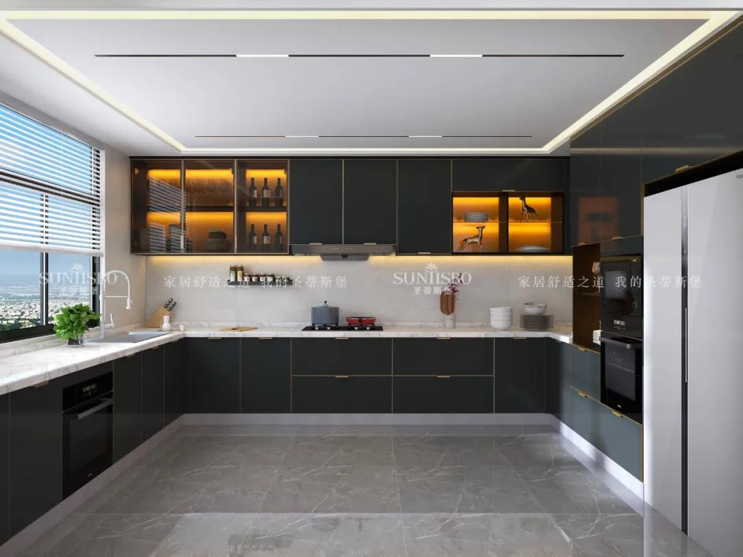 視覺色彩是激活感官的情緒支點,以色彩為重心的櫥柜系統,喚醒了簡奢廚房的關鍵所在。亮色金屬與深色實木柜體形成撞色櫥柜,極具空間爆發力。在深色柜體包裹中展現金屬、玻璃、實木的高級質感,剛毅線條交錯延續,一秒就點燃了時尚潮流的生活態度。