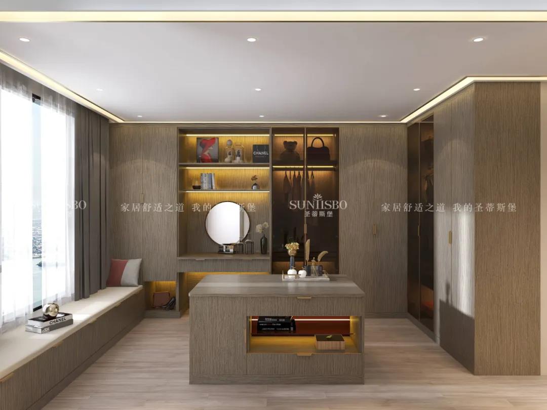 衣帽間采用L型的定制方式,色彩以及實木肌理一眼就能抓住眼球!島臺與立柜輕便組合,干脆利落。設計師巧妙的運用不同的材質,從大布局到小細節,從衣物收納、展示收納到梳妝設計,迎合現代年輕人對時尚居家生活的訴求。