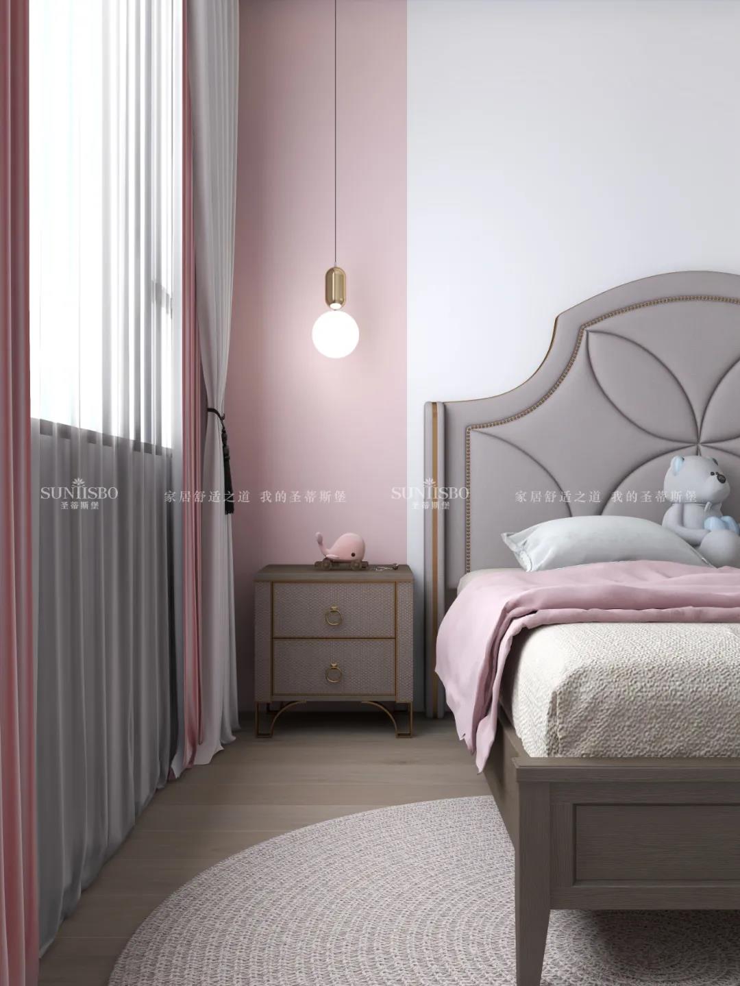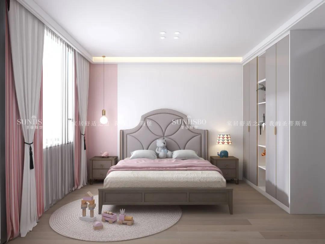 設計師以極致簡凈的白粉色調為基礎,從材質、光影到布局等方面進行輕盈處理,簡潔的白色調與光影充分互動,讓空間從空到滿進行變換,滿足一個小女孩的所有少女心,讓品質生活理念從小培養。