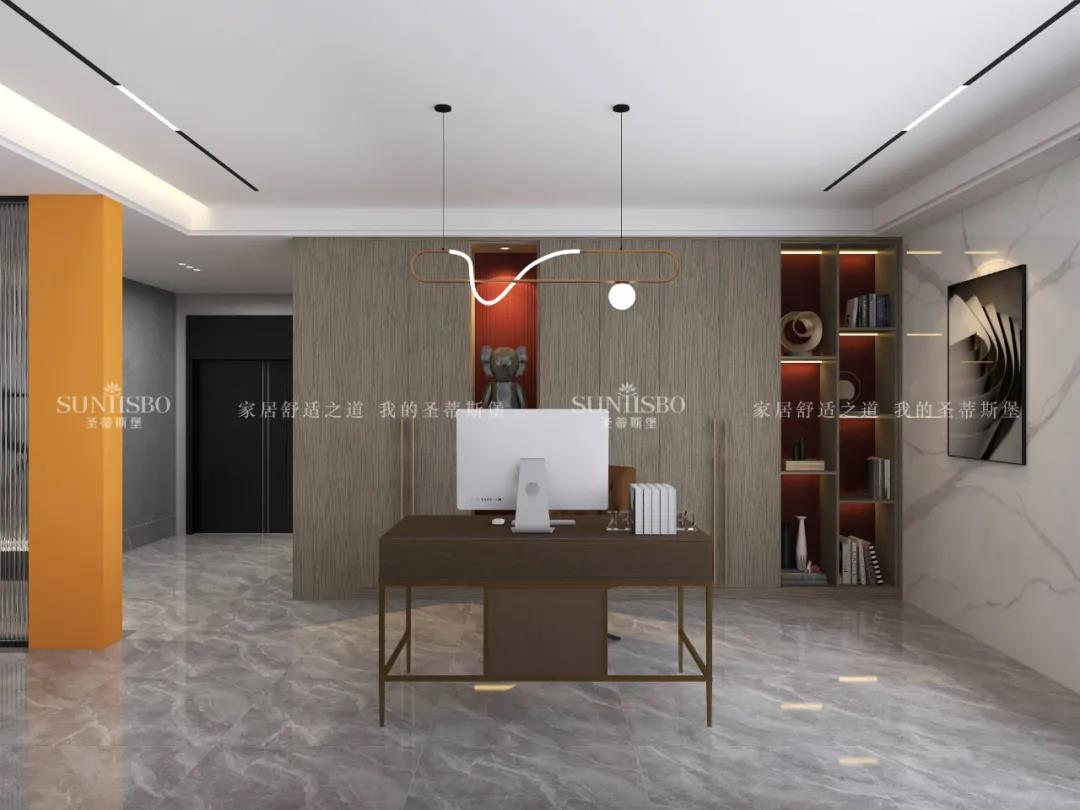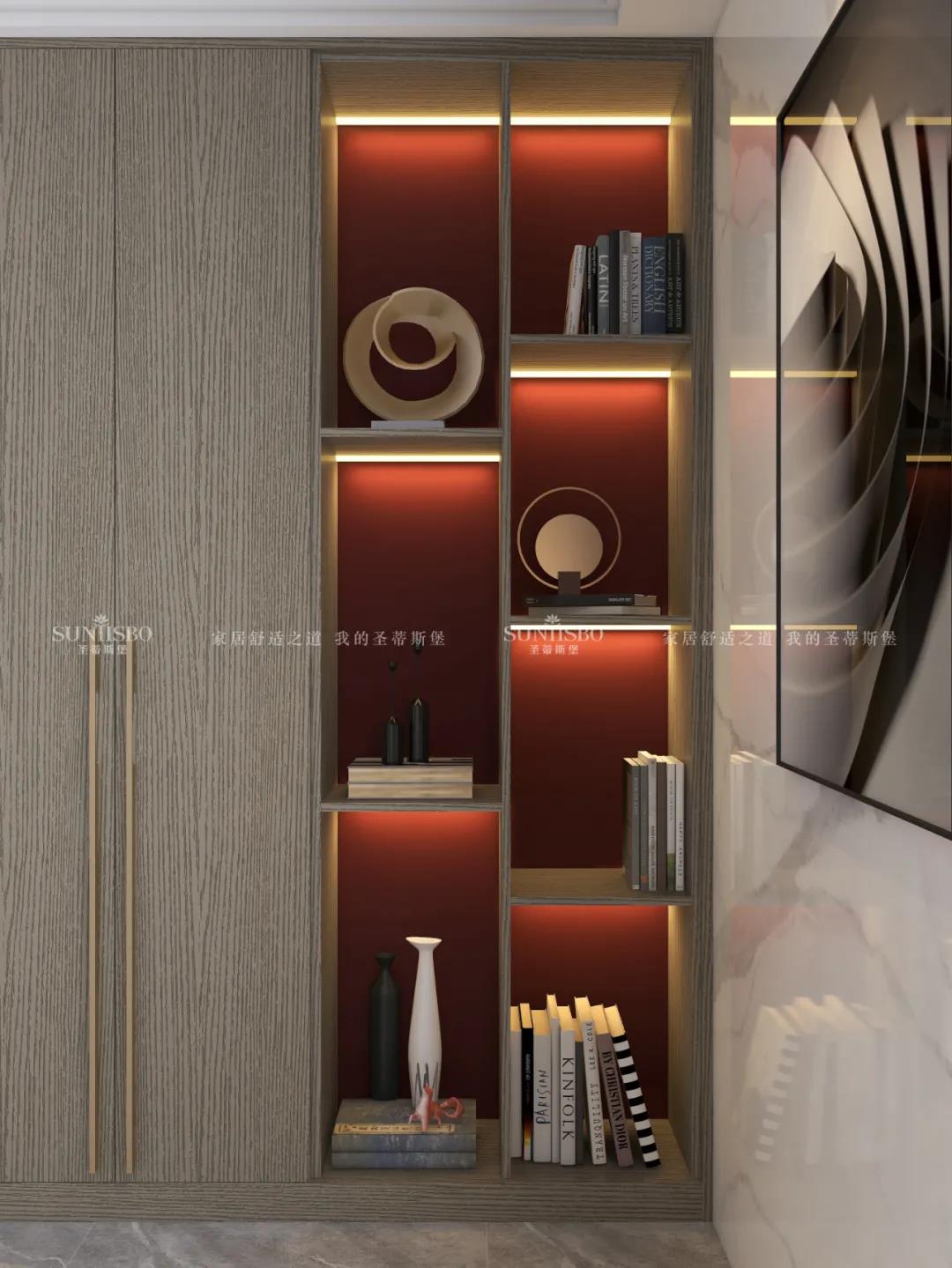 書房自成空間,無多余阻隔,注重與家人之間的互動。全落地實木書柜加入氛圍燈的渲染,勾勒出無負擔的工作閱讀空間。書桌著重金屬點綴,采用簡潔干練的空間線條與體塊,在舒適與品味的維度上,讓空間簡奢質感得到升華。