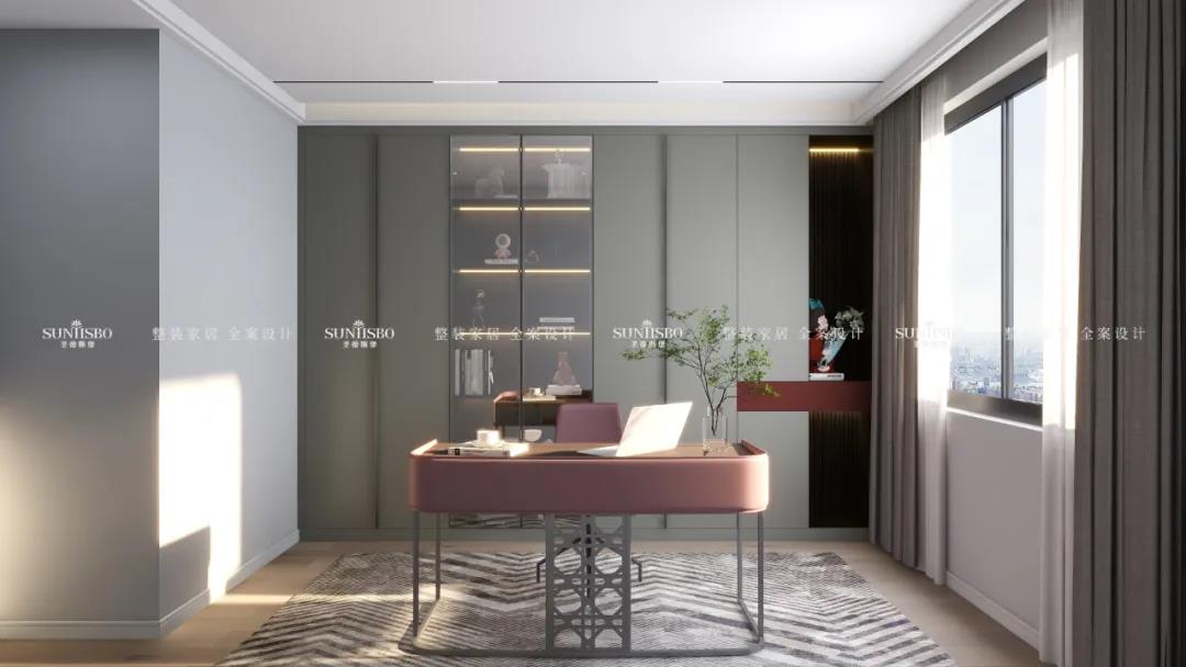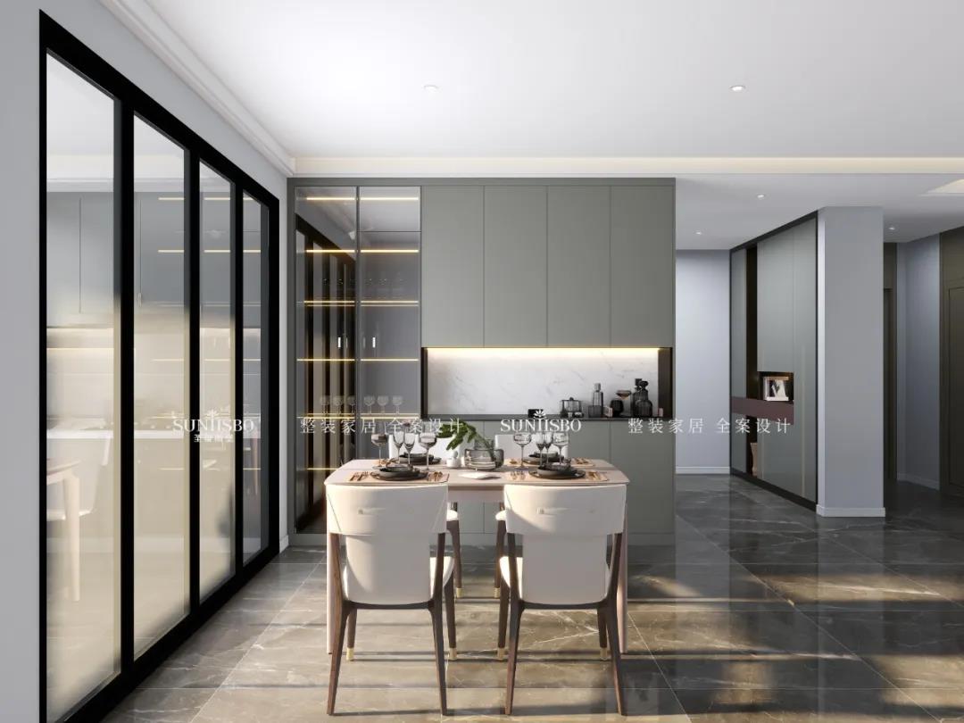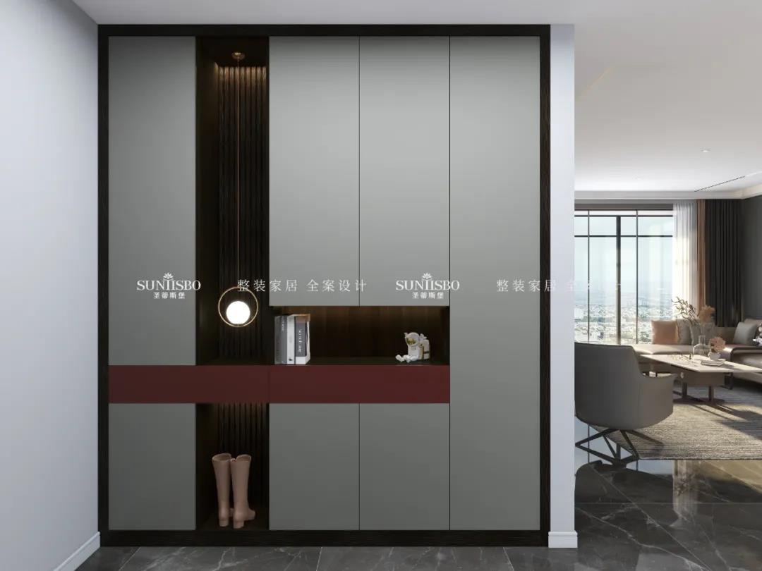 灰色平板門和煙熏色柜體做深淺搭配,搭配深灰鋁框門,整體簡單又大氣,再點(diǎn)綴一抹赤紅色,點(diǎn)亮了整個(gè)空間。